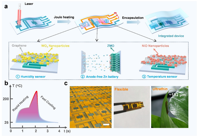 随着物联网、人工智能和智能机器人技术的快速发展,对具备能量存储与多模态感知功能的高度集成微系统的需求日益迫切。然而,传统制造方法往往面临制备效率低、界面不兼容、信号干扰严重等问题,限制了系统整体性能的提升。针对这一挑战,研究团队提出了一种基于焦耳热效应的超快构筑策略,实现了在8秒内完成无负极锌离子微...